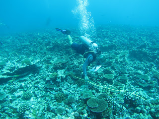 After a short flight from Mahé to Denis, we settled in to our accommodation on the staff estate and had a bite to eat before getting to work. The dive center was short on clients that afternoon, so they took us on a private cruise to the dive sites Batfish and Aquarium, where we started our surveys. Georgia surveyed fish while I surveyed coral, swimming a 50 meter belt transect and recording the percentage of substrate covered by hard and soft coral 2.5 meters to either side of the transect and every 5 meters along the transect.